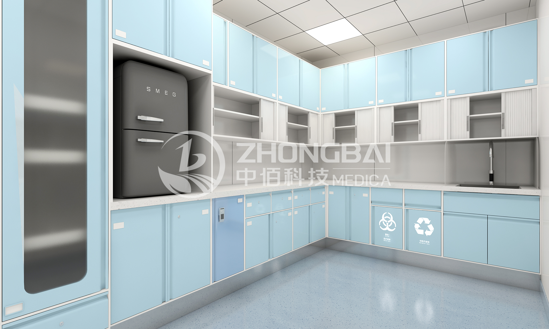 治療室設在護士工作站附近,主要為醫護人員進行治療準備、藥液配置的專用工作室。室內設有專用操作臺,壁柜、藥柜、發藥車等,室內需潔污分區管理。